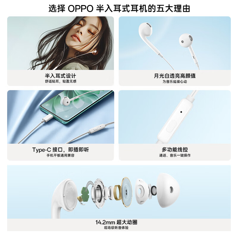 商品名称:OPPO 半入耳式有线耳机 Type-C 数字版 MH137 白色 CN